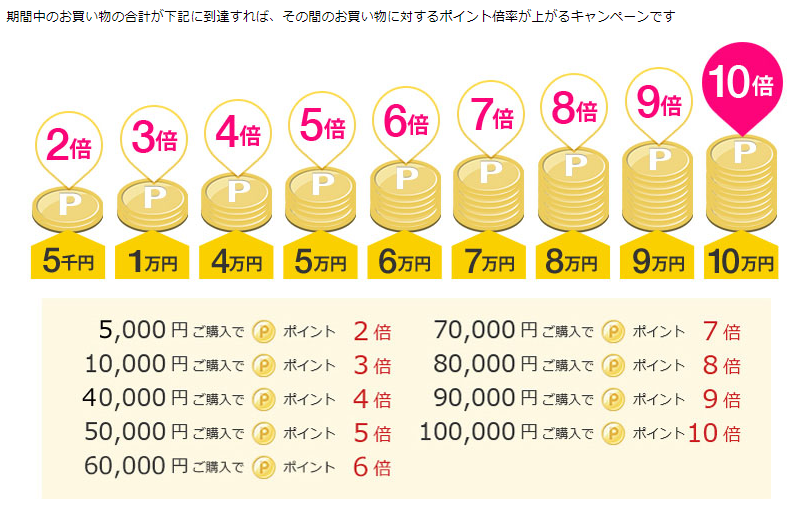 通常ポイントに加えて、期間中のお買物金額に応じてポイント最大10倍貯まるキャンペーンを開催!